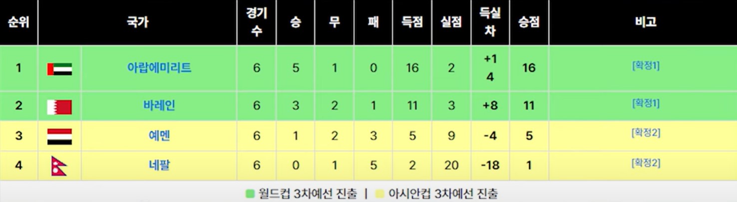 - A조: 카타르와 쿠웨이트가 각각 1위와 2위로 올라갔습니다.